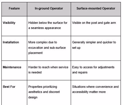 Once you understand your layout and the type of gate you’re working with, the next step is choosing the installation method that aligns with your goals. Every setup, whether mounted above ground or placed below the surface, functions differently depending on the mechanics of the operator and the movement of the gate. The method you choose should work naturally with your gate’s design and the performance you expect from it, which is why the selection process becomes more effective when you look closely at how each option supports your specific layout.